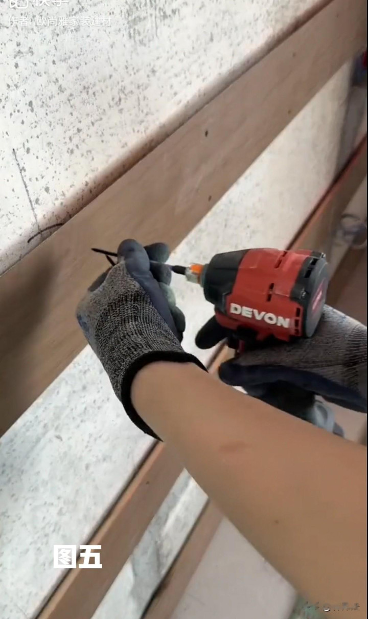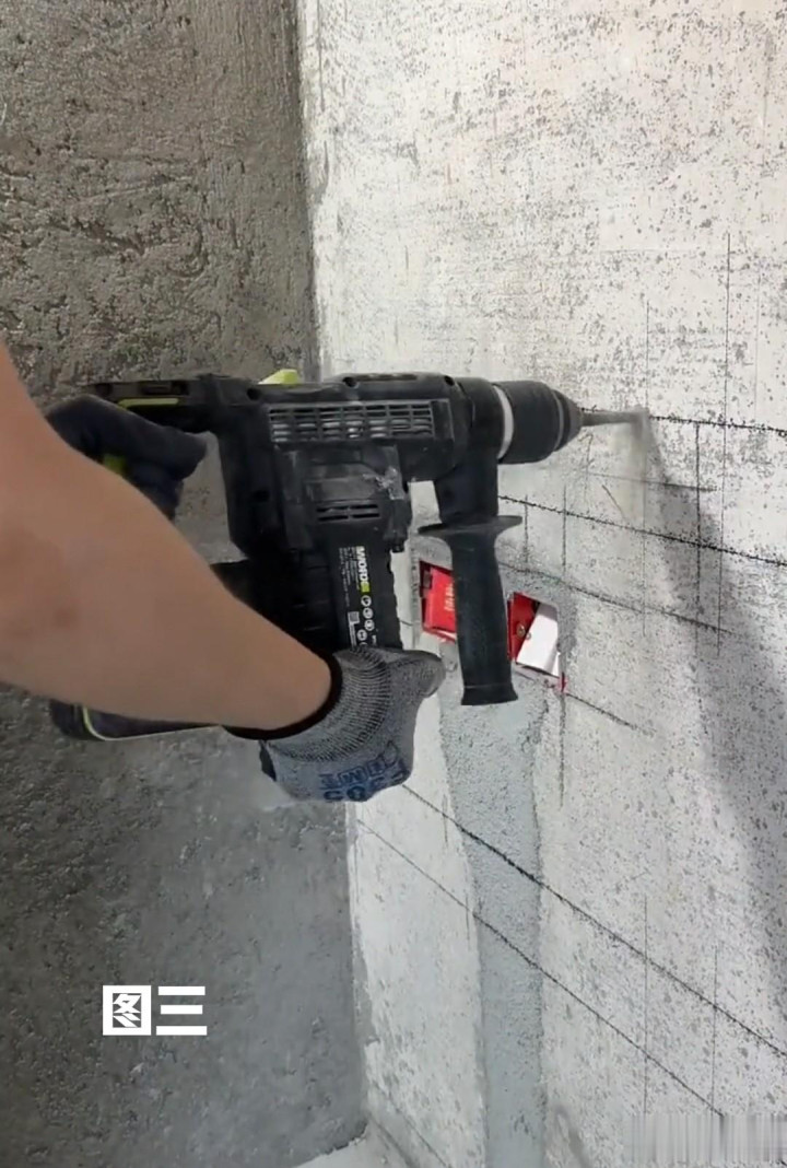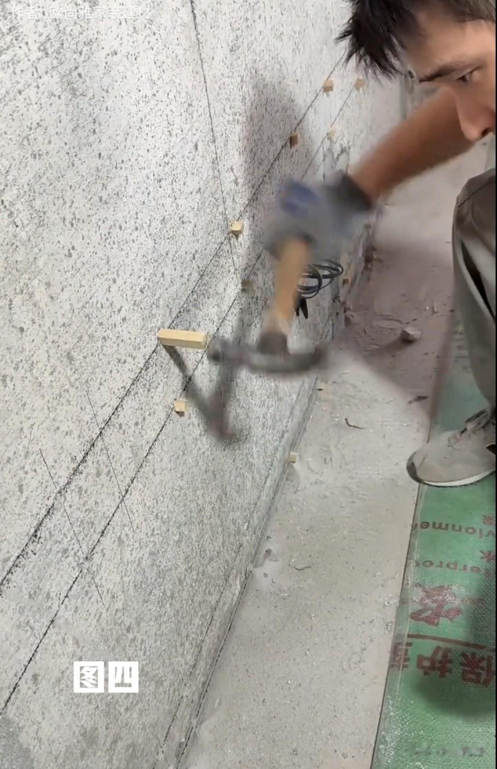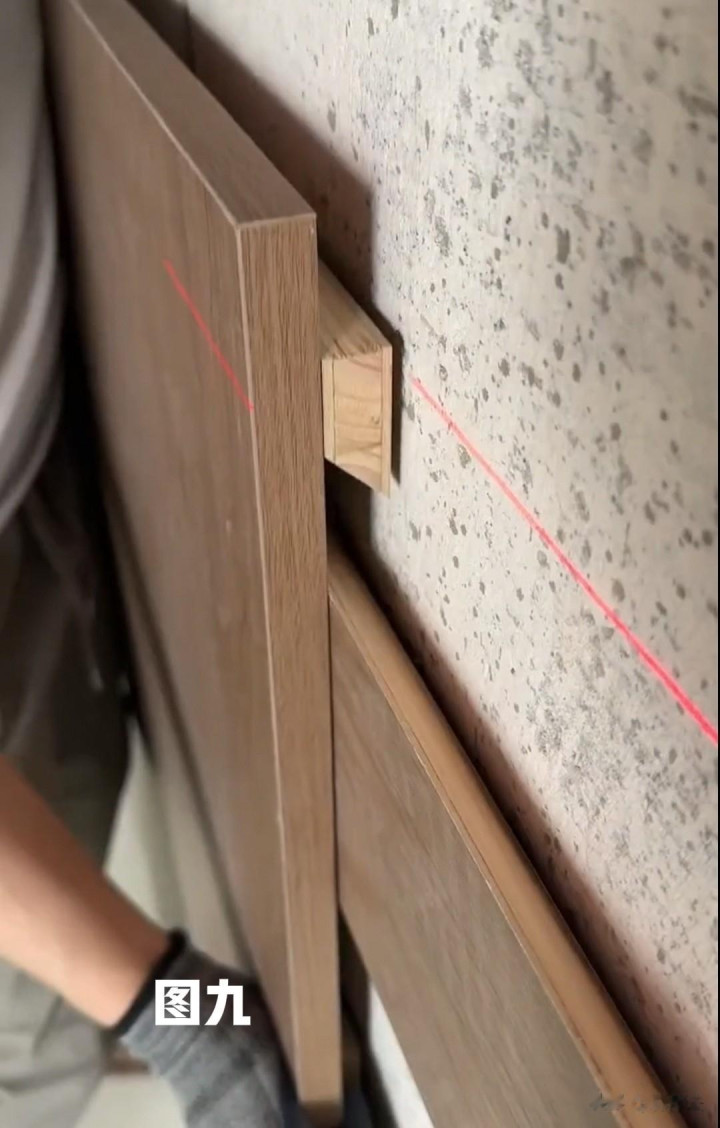 珍惜,这些线是装置床头挂条的平线,平线弹好后,在相宜位置用电锤钻孔,(见图三)再将钻好的孔位内部打入木楔子,(见图四)方便以后固定床头挂条时的螺丝拧入。但要记取,凡有木楔子的位置作念好标志,便于后续螺丝固定。