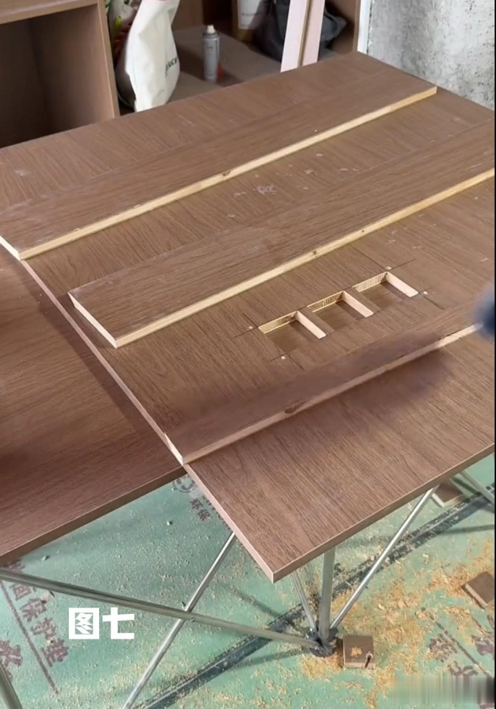 如图七所示,床头挂条固定好后,再把床头板上应挖出的插座孔位置用修边机挖出(见图八)然后就不错把床头挂到挂条上了。(见图九)