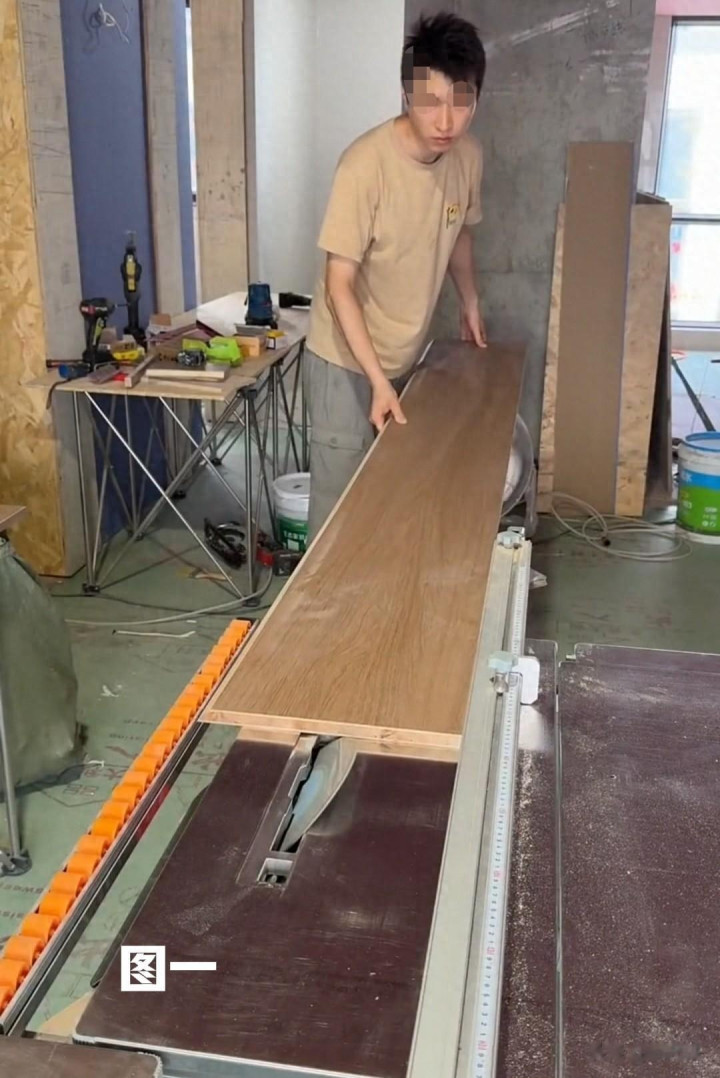 先把准备好作念床头挂条的板材备好,再用调好的45度推台锯,将挂条一分为二。(见图一)