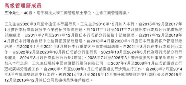 简历涌现,王冲,40岁,电子科技大学工商管理专科毕业,获硕士学位。王冲2016年12月加入泸州银行,曾任该行成王人研发中心业务拓展部总司理、成王人分行业务拓展部总司理、成王人分行业务十部总司理、蚁合更动中心信贷拓展部总司理、进攻客户管理部总司理、进攻客户奇迹部副总裁、成王人分行副行长等职务。王冲自2023年10月起代为实际泸州银行成王人分行行长职务,自2024年3月起担任成王人分行行长。