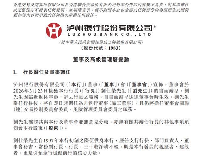 3月23日,头顶“西部地区地级市中首家上市银行”光环的泸州银行(01983.HK)发布公告,因驾驭退休年齿,行长刘仕荣、副行长薛晓芹同期离职,由该行副行长王冲代为诳骗行长权益。王冲年齿仅40岁,本年3月9日刚刚获批担任泸州银行副行长。