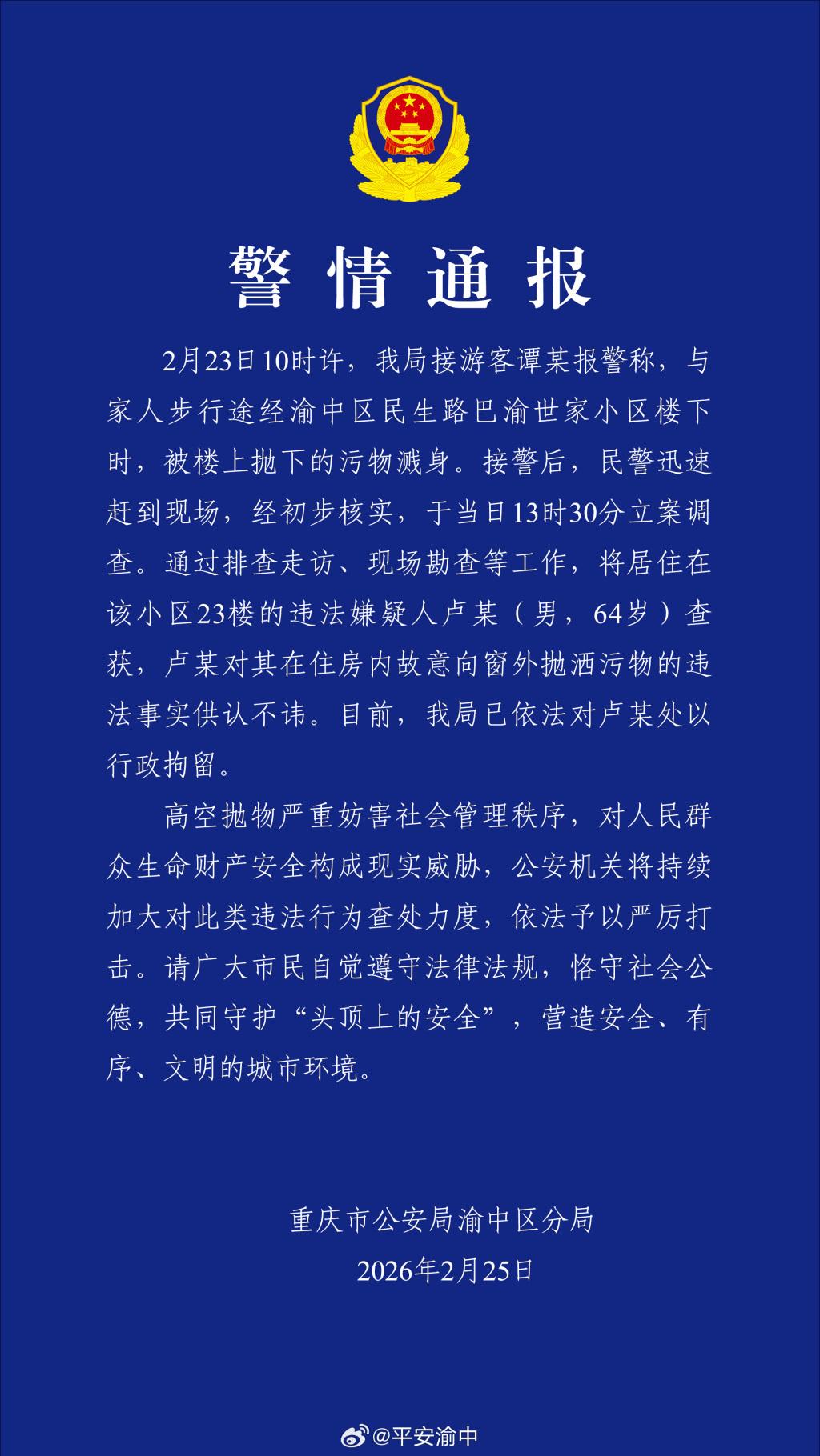 据@吉祥渝中音问,重庆渝中区警方通报“搭客被高空抛下秽物溅身”,