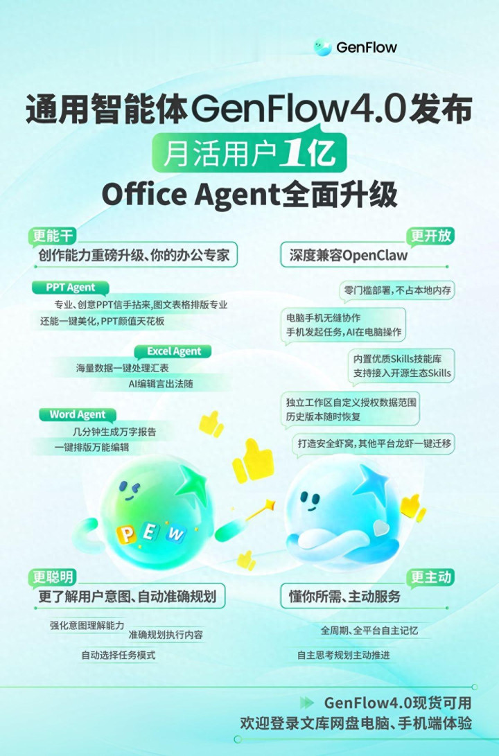 通用智能体GenFlow4.0月活用户超1亿,Office Agent成最强「办公众人」