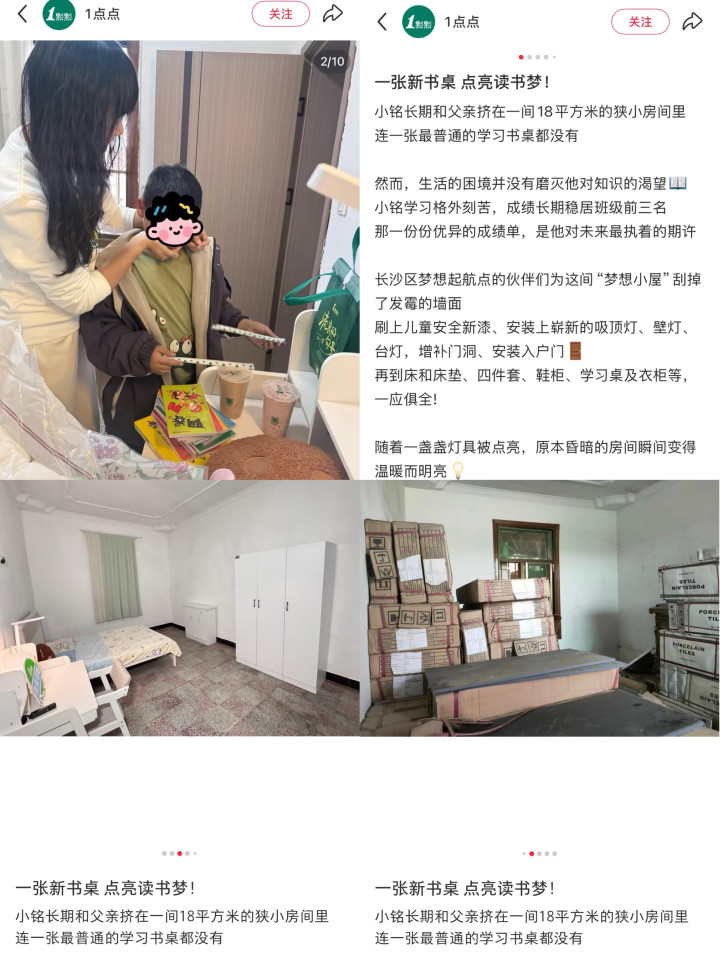 少量点此前发布的帖子显现,企业公益团队帮扶的这户家庭中,小男孩与父亲本来挤在一间18平素米的忐忑房间里,连一张学习书桌齐莫得,为此公益团队匡助该家庭刮掉发霉的墙面、刷上儿童安全新漆、装置学习书桌和衣柜等。不外,少量点展示的图片受到争议,图片中,小男孩被指穿着上千元的腕表、小男孩书桌上摆放数本《阿衰》漫画书、该家庭校阅前的房子被质疑为杂物间等。