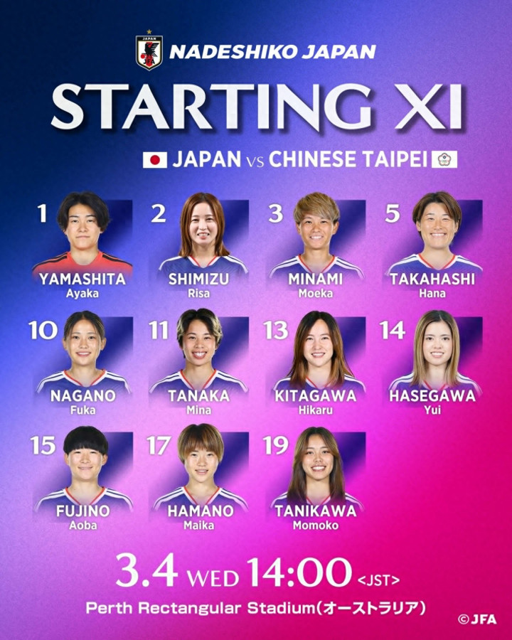 先锋:11-田中好意思南(犹他王室女足【好意思国】)、15-藤野青叶(曼城女足)、17-滨野舞香(热刺女足)