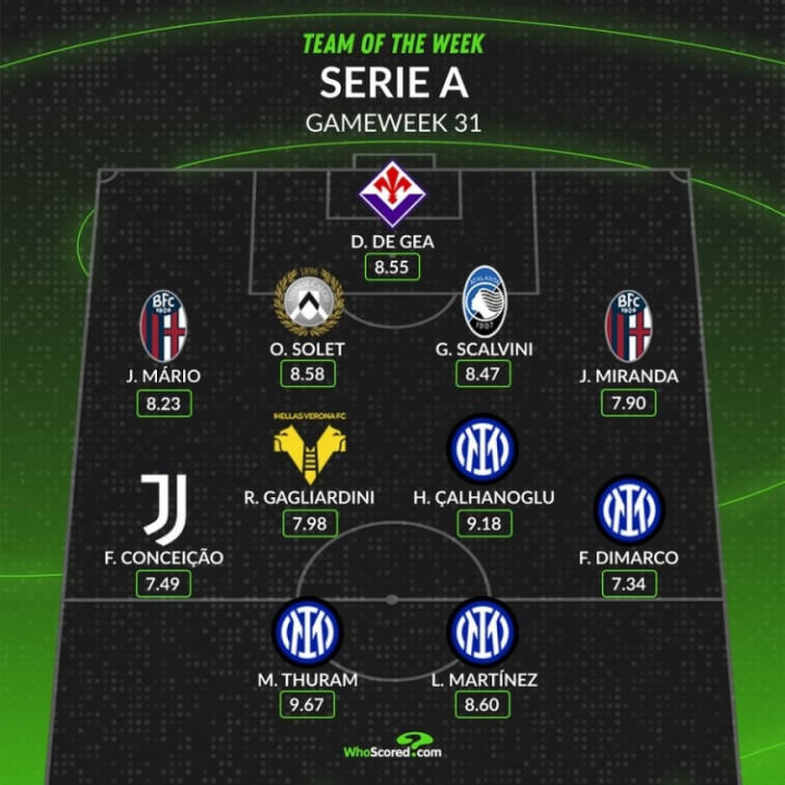 直播吧4月7日讯whoscored统计了本轮意甲评分最好阵,小图拉姆领衔国米4将在列。