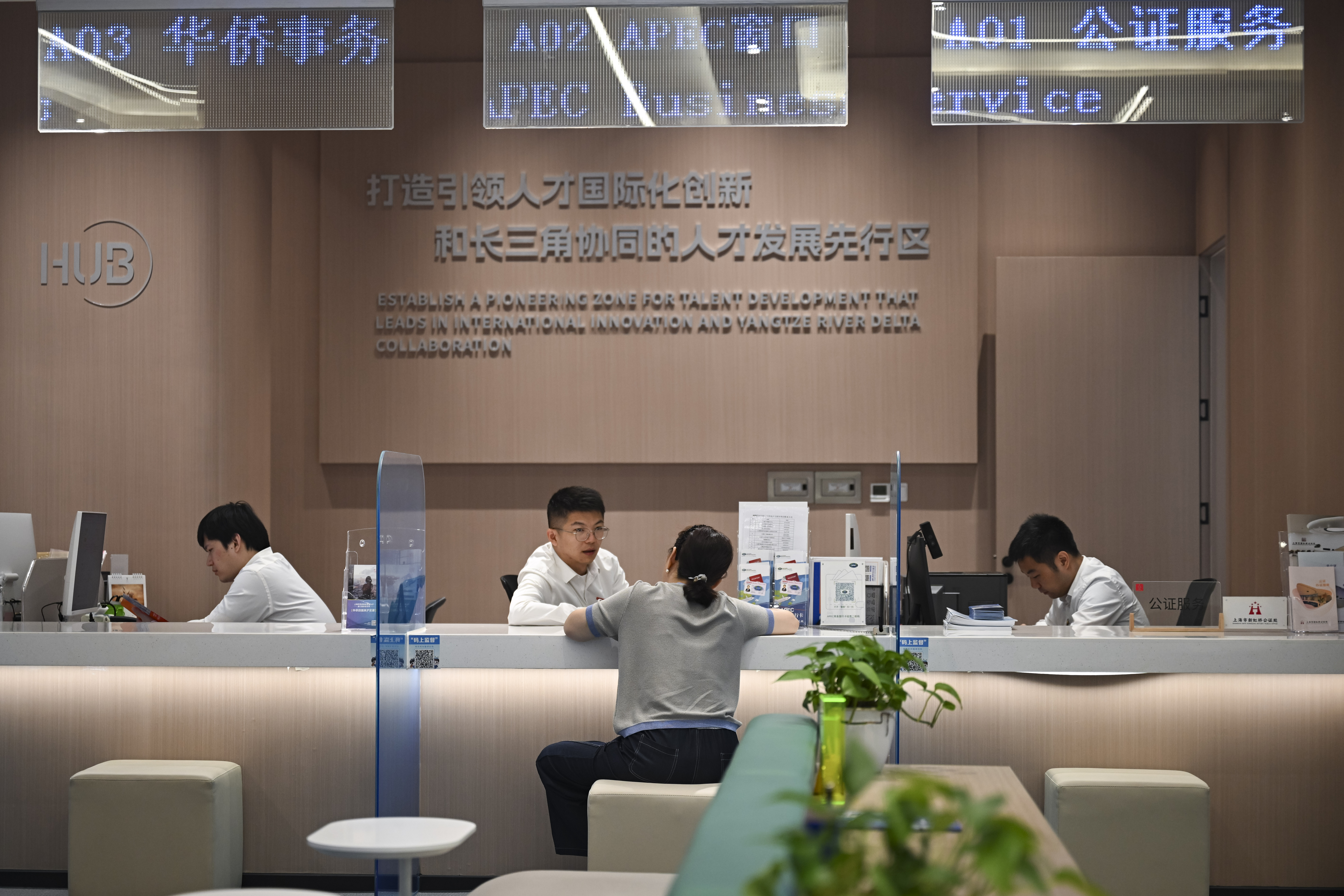 2025年9月10日,市民在上海虹桥海外东谈主才服务中心办事大厅办理业务。新华社记者 陈浩明 摄