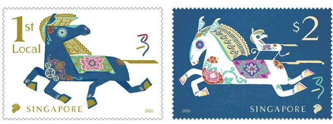 这套马年邮票是新加坡刊行的十二生肖系列里的第七套,共有两种面值,一种是6角2分的“第一级腹地邮资”(1st local)腹地平邮邮资。白底蓝马,马身点缀着金币、斑纹,还有近似牡丹花的彩色元素,看起来豁达又讨喜。另一种是2元面值的邮票,开云体育app蓝底白马,撒欢奔驰,背上还带着一匹小小马。