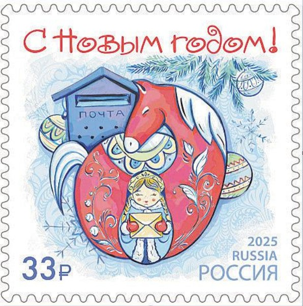 俄罗斯这张马年邮票平直把童话感拉满。红鬃马蜷成顺心的看守圈,雪小姐套娃捧着信封递来新年好运,蓝调配景裹着松枝与雪花,俄文“С Новым годом”(新年欣慰)甜到心巴。