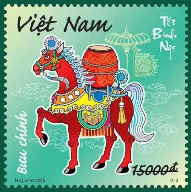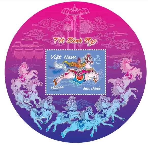 2026年丙午马年,越南邮政刊行的生肖邮票包括一套2枚和微型张1枚。生肖邮票中,一白一红两匹九鬃骏马,驮着传统喜庆饱读乐的邮票,标志新春茁壮与阴阳协调。
