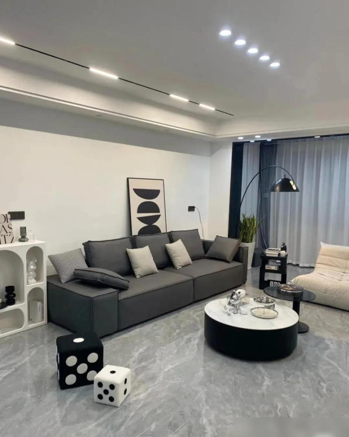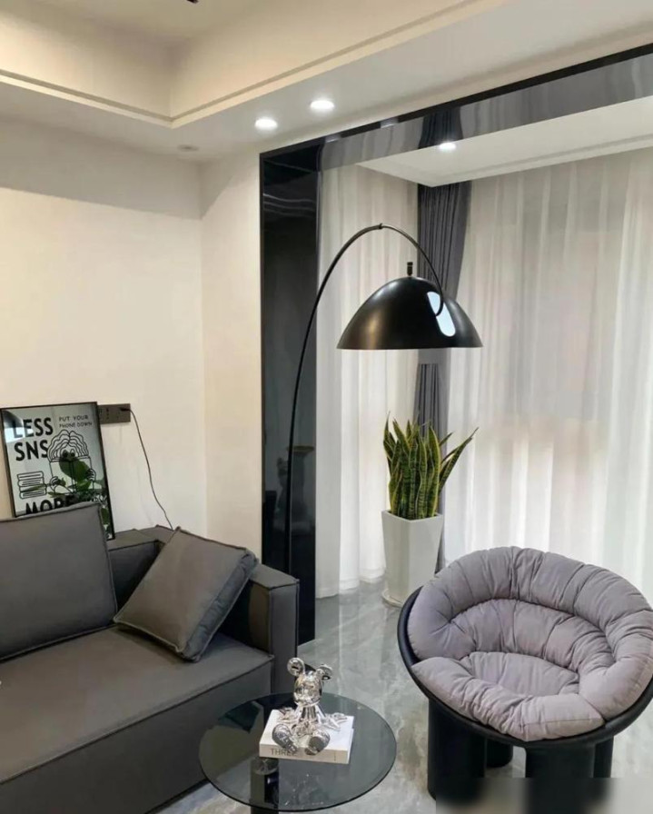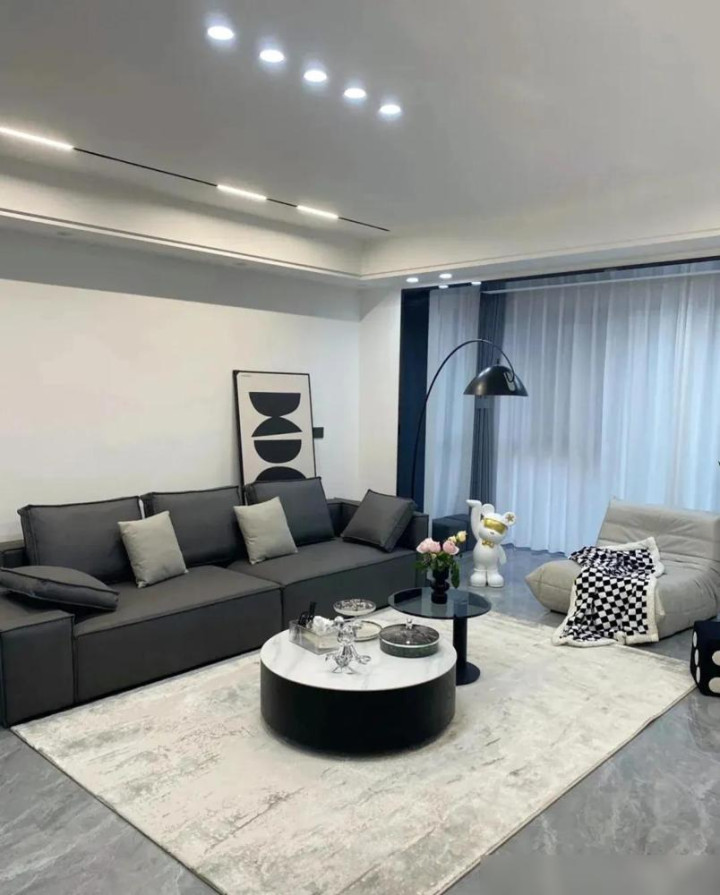 不外,短长灰弄不好就容易显得冷飕飕。就像冬天只穿件黑大衣,看着挺酷,家里待深切可能以为不够暖。这技巧,木地板和软装就关键了。卧室通铺鱼骨拼木地板是对的,脚感温润,能中庸不少冷感。沙发选深色直排加个毛毛虫单椅,再配个圆茶几,成见挺好,但情愫和材质若是太单一,还是硬。