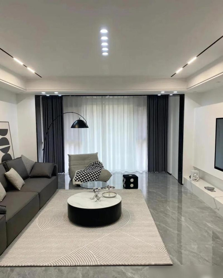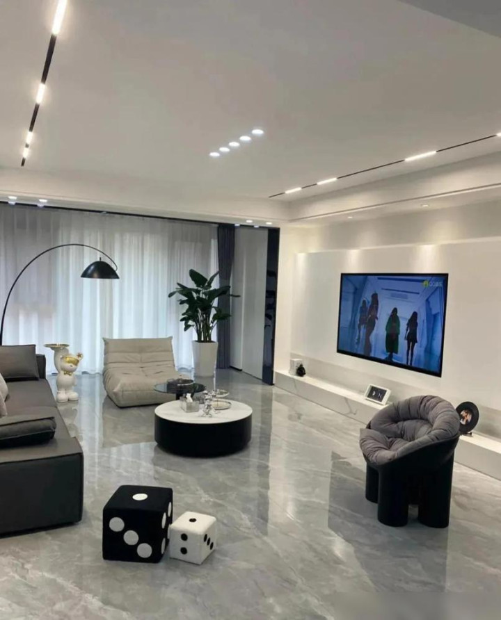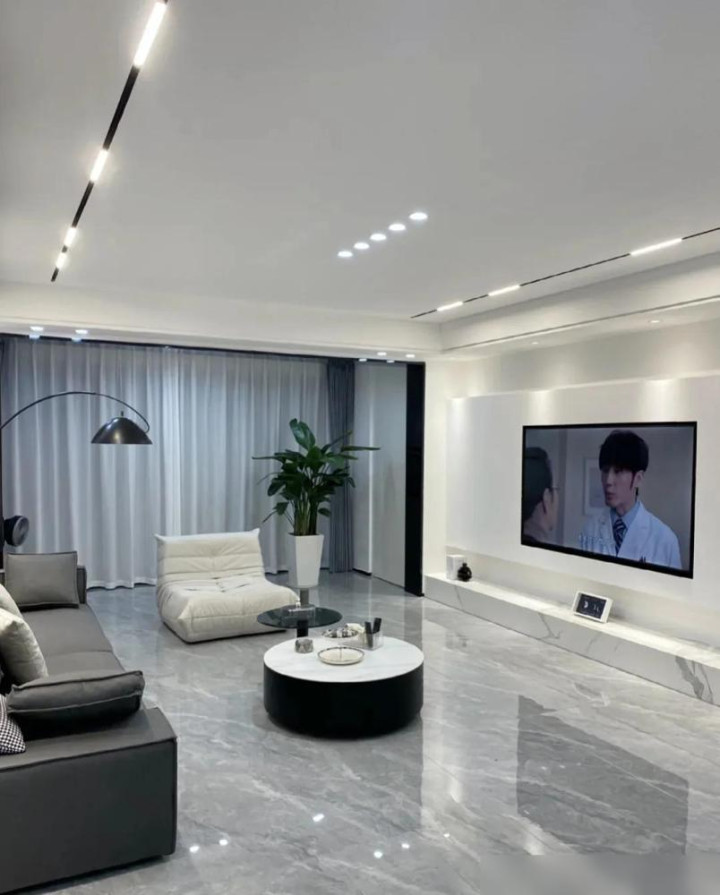 先说优点。买通阳台这招照实高妙。推拉门一拆,客厅立马敞亮。亮面灰砖通铺,不作念波打线,视觉上就显大。无主灯筹算现时也流行,没了大吊灯,层高嗅觉皆上去了,打扫也宽心。这些手法,对大巨额家庭皆适用,属于拦阻易出错的“安全牌”。