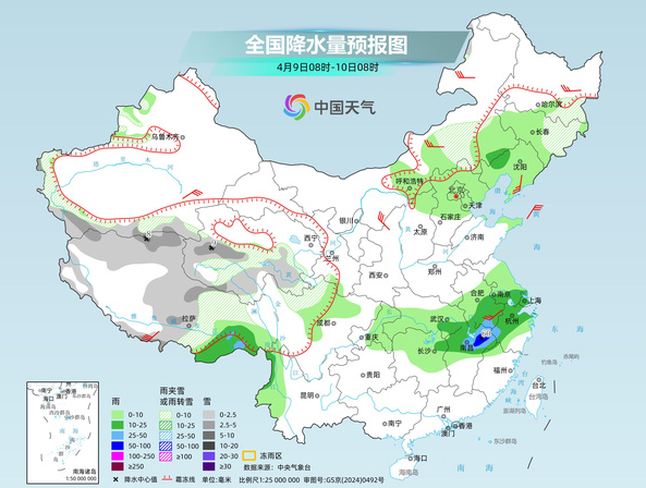 中央表象台瞻望,今天,新疆南疆西部山区、西藏西部和南部、青海东部和南部、川西高原北部、内蒙古东南部等地部分地区有小到中雪或雨夹雪,其中,西藏西部局地有暴雪;西藏东南部、山西南部、河北南部、北京西部和南部、河南大部、山东南部、江汉大部、江淮大部等地部分地区有中到大雨,其中,河南南部、安徽中部、湖北南部和东部等地部分地区有暴雨或大暴雨。